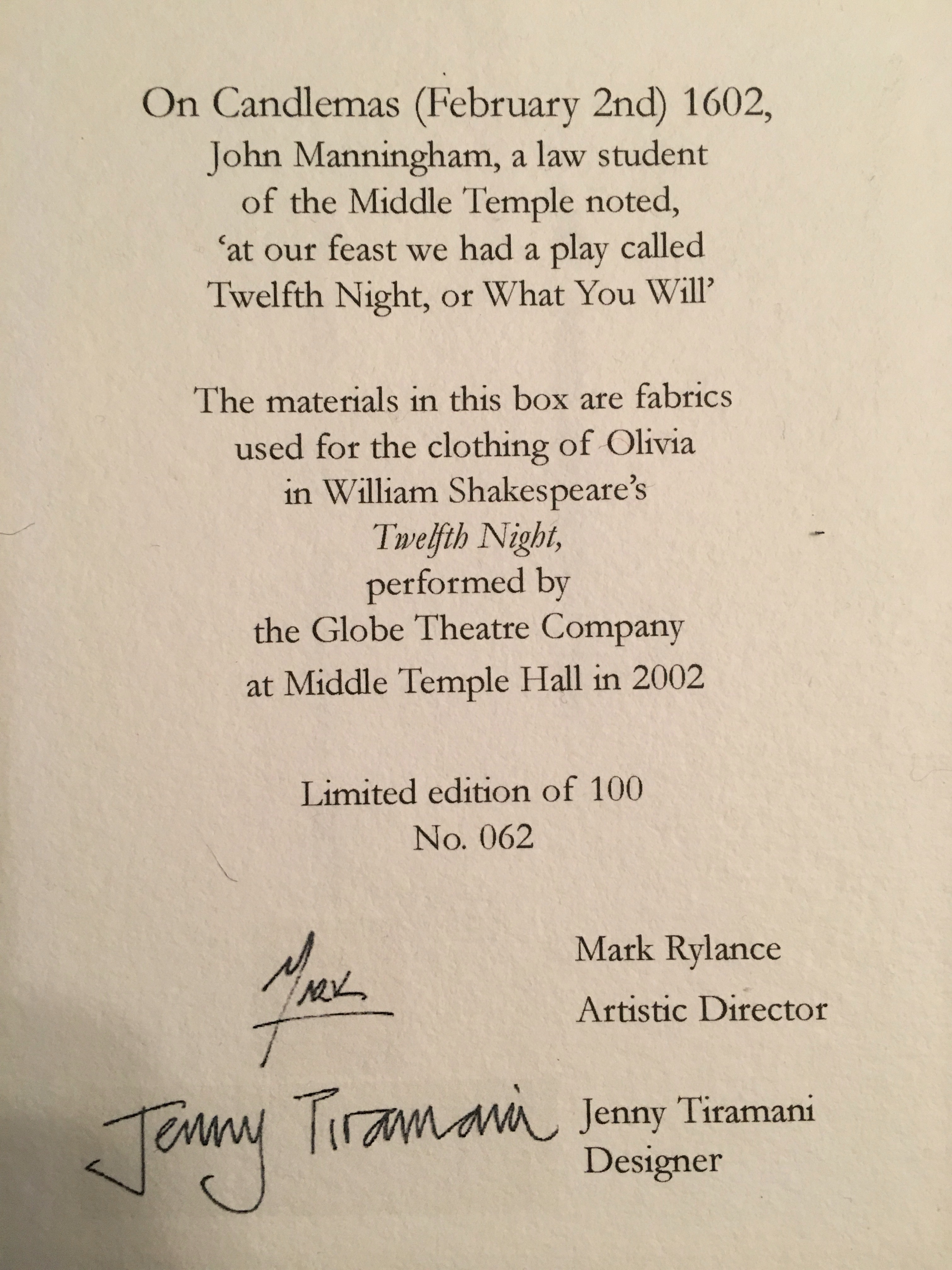 In her first scene as Cesario, a servant named Curio remarks to her that Orsino has shown favor to “him” from the very beginning. This might explain the rich garments that Viola wears in this production, which resemble a noble gentleman more than a servant.