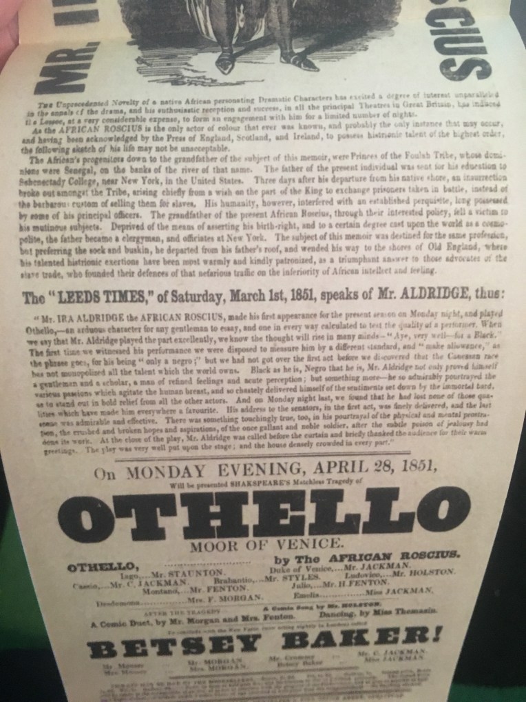 Going further back, the first genuine black actor to play Othello was Ira Adrige, an African American who moved to England in the mid 1800s. Above is a copy of the playbill for his celebrated touring performance of Othello in 1851, which inspired very powerful and polarized reactions: https://youtu.be/92Z-4eJj7Wo