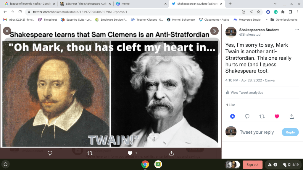 So as an en educator and a father, I want to focus on the Shakespeare conspiracy not just because it gets my dander up, but also because, compared to these other theories, it is actually one of the least harmful. Conspiracies like the Plandemic hoax are extremely dangerous because they dissuade people from getting a life-saving treatment, and allow this pandemic to continue. By contrast, ultimately it doesn’t really matter who wrote Shakespeare’s plays, so I think this kind of exercise is useful for educators to challenge students to think critically about this low-stakes theory, and then applying the same skill to others to become better-informed thinkers.