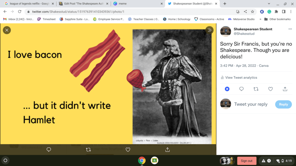 As the name implies, Anti-Stratfordians don’t so much believe in Bacon, Pembroke, Oxford, etc, so much as they actively choose not to believe in William Shakespeare of Stratford. This means they will use every bit of their energy trying to prove that theory, and won’t stop until they find something, no matter how nonsensical, to prove their Shakespeare is the real Shakespeare.