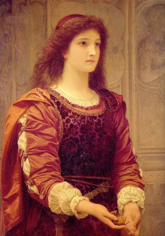 You can also see in these costume renderings the influence of Pre-Raphelite artwork on the costumes, like this famous painting by Francis Dicksee (1884).