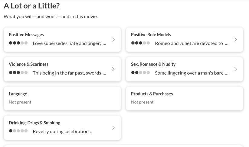 If you are a teacher, I would recommend you show parts of the movie, specifically the fights and some of the action in the second half rather than the whole thing, but once you read the rest of this review, you can draw your own conclusions. As I mentioned before the Shakespearean dialogue is heavily cut, new ‘modern’ dialogue is added in, and even some of the action is also changed. Because of this, DO NOT TRY to read the play along with this film, as your students will get extremely frustrated. In my class, I actually played a game where the students write down what the movie changed from the play to try and get them to engage with it. I would also recommend asking questions or quizzing the students on the plot or the famous lines since those are more or less intact.