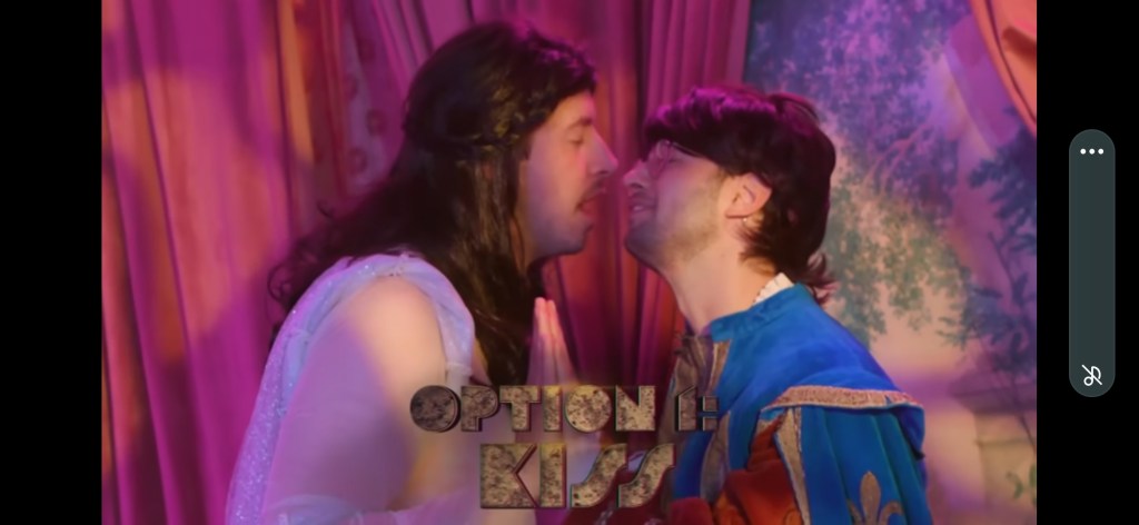 The set for “Romeo and Juliet,” seems like an ordinary YouTube TV studio, in that it’s fairly small and it does not suggest any particular period. It kind of suggests somewhat of a dream-like environment; there are cardboard cut outs with some clouds, the lighting is warm with a few pink colors . Most of all it reminds me of a fractured fairytale more than classic tragedy, (which I suppose is clever in itself because it sets up that the Try Guys are going to fracture Shakespeare the same way people like the Muppets fractured fairy tales.