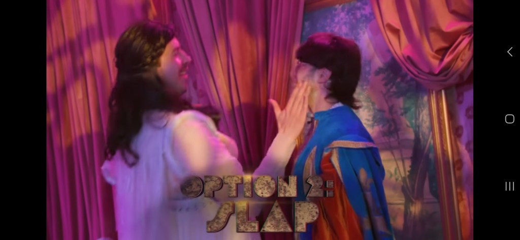 The costumes don’t seem as elaborate or historically accurate as the ones in the previous video, which is a shame because it would’ve been really nice to see the Try Guys walk, fight, and dance in the same costumes that they experimented with in the previous video. That said, the costumes certainly are functional within the story. Eugene as Mercutio has a stylish striking black outfit that certainly suggests somebody you don’t want to mess with. Zach as Romeo has an amusing long wig (romantically disheveled of course) and a blue doublet (though I miss the pumpkin pants in the previous video). As in other productions, the Montegues wear blue and the Capulets mostly wear red. I would be surprised if the director had seen the famous Franco Zephirelli film (or at least Gnomio and Juliet).