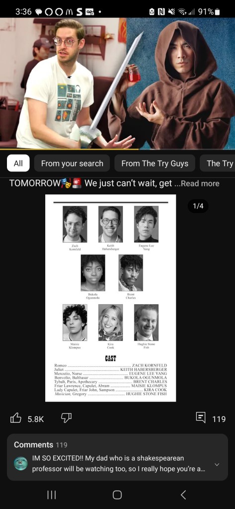 If you would like to learn Shakespeare like the Try Guys, I have a series of online clases in acting, stage combat, Shakespearean comedies, tragedies, and of course, “Romeo and Juliet.” You can enroll in one of these classes now or schedule one with me by visiting my Outschool.com page: