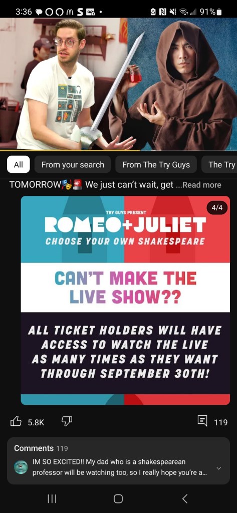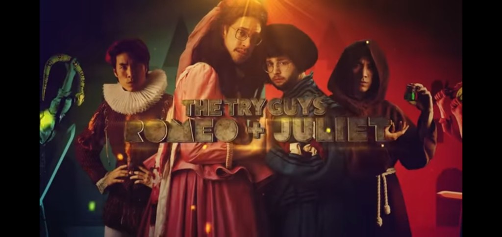 I was excited from the beginning to hear that the Try guys were going to bring Shakespeare to YouTube in a way that was fun and accessible. My expectations were that they would make fun of the play with care; I was hoping that they wouldn’t mock Shakespeare, (or mock people who like Shakespeare). I was also hoping that they would critique the characters without outright mocking them and find ways to make the play connect to modern audiences. I think they achieved all those things and more!