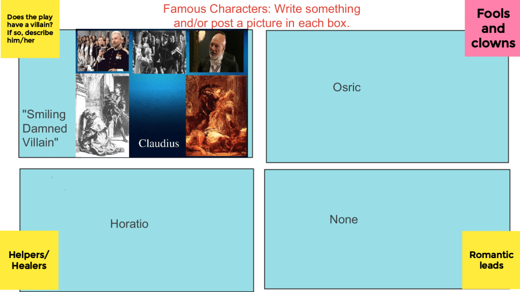 I then asked the students to research the play they got, then asked them to fill out a Jamboard, like the one I made below- using photos and short descriptors to get a general idea of their new favorite play!