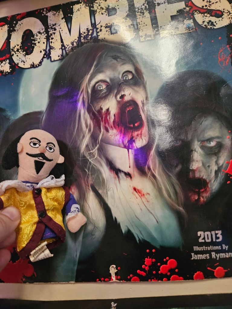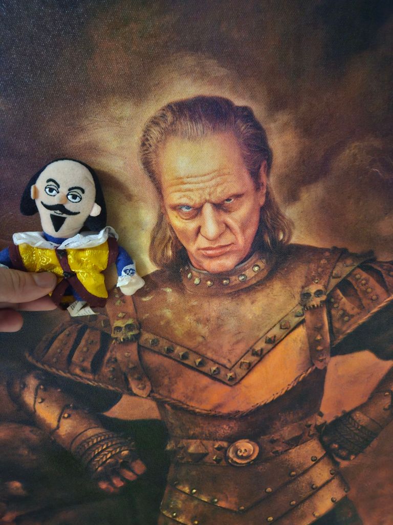 This joke got me thinking- Hamlet has a comic scene where the prince and his two friends are running around the stage away from a ghost, one that refuses to speak to them and then terrifies them. This reminds me of the moment where the ghost of the librarian shushes the heroes, and becomes a hideous creature: