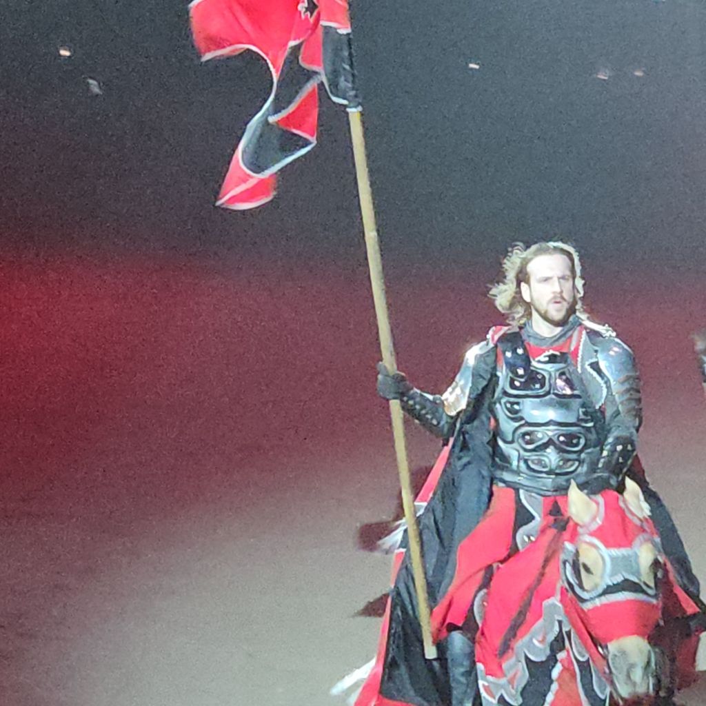 In most (but not all) interviews and clips I’ve seen, the Green Knight is the bad guy- the one Knight whom almost everyone is supposed to root against. When I got home, I wondered why this was. After all, isn’t the black knight usually associated with villainy? My personal theory is that this is a subtle reference to the classic medieval story, Sir Gawain and the Green Knight. The eponymous Knight is supernaturally strong and able to even survive decapitation! He serves in the story, as the ultimate test for our young hero, Sir Gawain. I think the writers of Medieval Times definitely did their homework, making this Knight the antagonist.