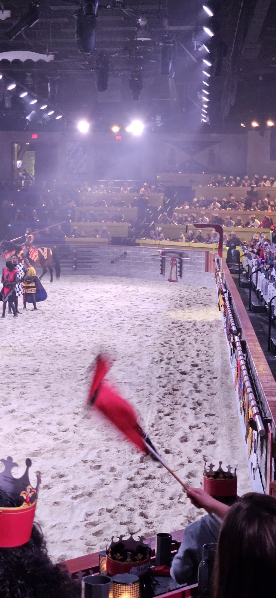 Chivalric ideals aside, the joust also had a practical purpose- it was a way for knights to train for war, an a way for them to win fame, money, and good reputations at court. As you can see in the photos above, the knights were separated by a wooden barrier called “the tilt wall.” Each knight was identified by the colorful designs on their banners, shields, and the blanket draped over the horse. Once the king or marshal threw down the warder, the knights charged headfirst at their opponents, armed with shields, lances, and full armor. Knights scored points for breaking lances and shields or by knocking other knights off their horses. Naturally, to create the most impressive display possible, all the knights at Medieval Times fell off their horses and no lances broke.
