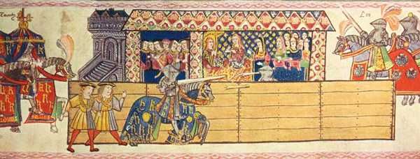 This was followed by a "tourney" in which mounted knights ran at each other without a tilt barrier (as pictured here).>