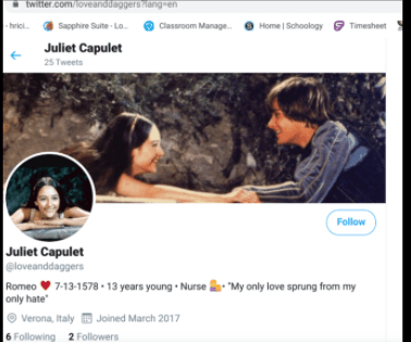 Believe it or not, Romeo and Juliet are very active on social media, despite the fact that they are fictional, 300 years old, and dead. One enjoyable and engaging activity I’ve seen is telling their story through blogs, twitter, emoji, Facebook, etc. Here are some accounts that you can reference: