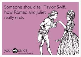 I’m not exactly a Swifite, and I know I’m running the risk of offending MILLIONS of people here by offering criticisms of Taylor Swift, but I honestly think it’s a good idea to be able to critique the things you love. In the past I’ve criticized Shakespeare’s plays, his characters, and even suggested that he might be racist. I would like to offer that, in the case of Love Story, Ms. Swift simplifies the plot of Romeo and Juliet, and leaves out its tragic elements, which kind of misses the point. As an allusion, it seems a little watered down. That said, I feel other TS songs are better, use their allusions more skillfully, and create a more coherent picture in the listeners’ mind. Dispite my issues with this one song, I heartily admit that Ms. Swift is prolific, talented, and has created songs that are classic works of art!