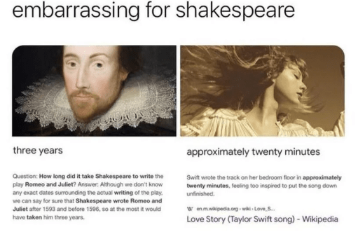 What I’m not interested in doing is getting into a “battle” where I try to justify Shakespeare as being better than Taylor Swift. When I see memes like the one above, it makes me immediately disengage with whoever posted it. I don’t want a Swiftie to talk in the comments about how Shakespeare was a talentless hack. Alternatively, I don’t want a Shakespeare nerd to dismiss Taylor as being infantile or any other critique. Both these writers had different goals, went about them differently, and achieved success in their own special ways. So now, let’s look at how Taylor Swift borrowed from different literary traditions to make her songs more dramatic, more visceral, more insightful, and more poetic.