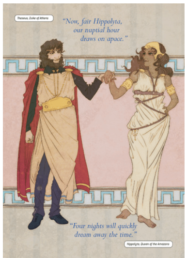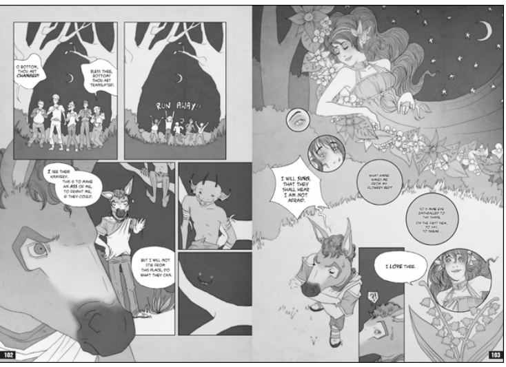 Character Design. It’s interesting to see the difference in style between this version, and the Manga Shakespeare version I previously read. That one was very much inspired by the Shoujo manga style, which emphasizes drama and relationships. This version’s drawings are softer, more cartoonish, and the expressions are less stiff, (except for Oberon, who is drawn very austerely). I particularly like the design for Puck with his big mischievous eyes and squat, childlike shape. I would argue however that the lovers and Mechanicals aren’t distinct enough, which is a problem since they are the most important characters.
