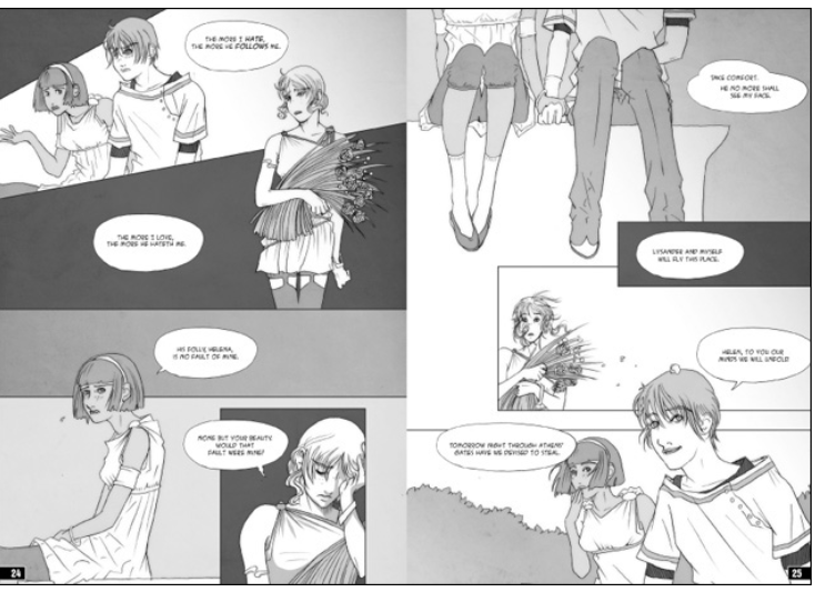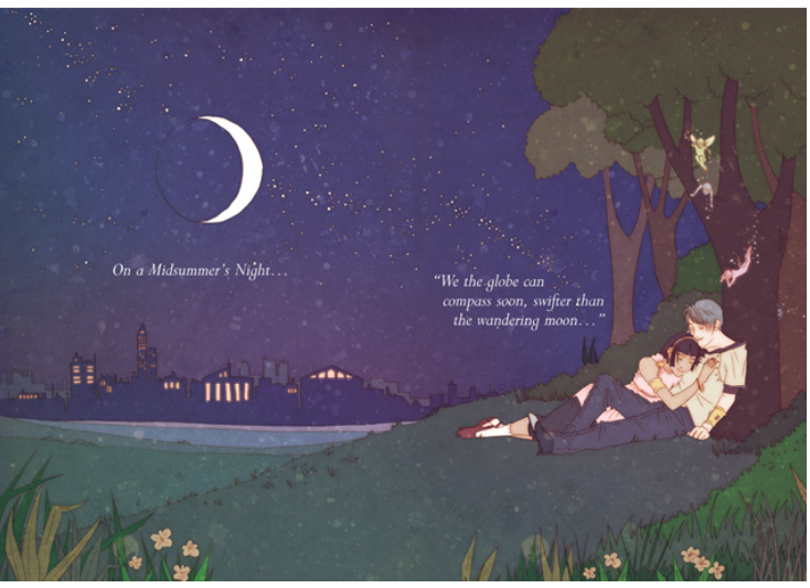 Sometimes the over-the top nature of manga drawings works well with this play. When Helena is mooning over Demetrius, we can see highlights in her eyes that work very well within the big-eyed, expressive style of Manga. By contrast, some other characters like Oberon are drawn very sharply, making him appear stern and even grim.