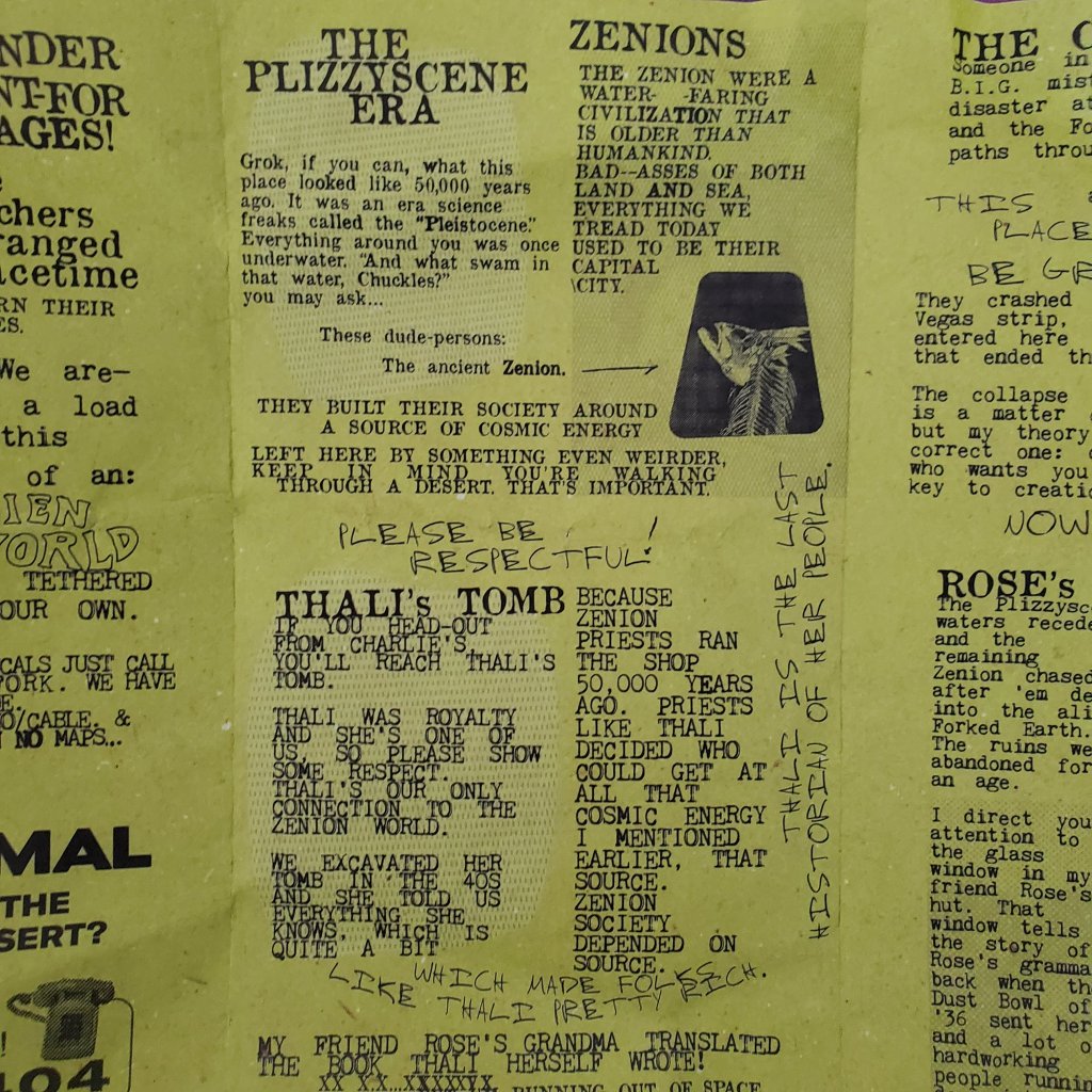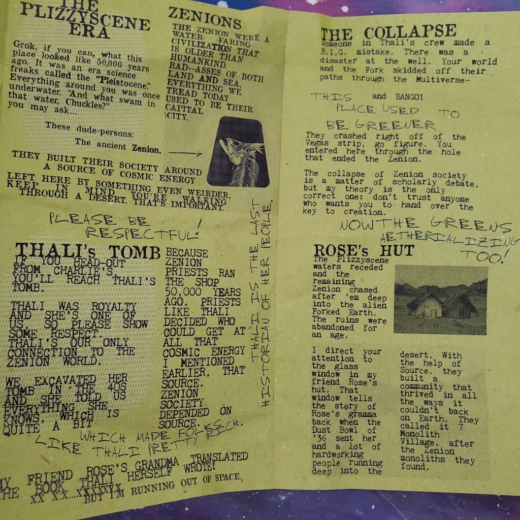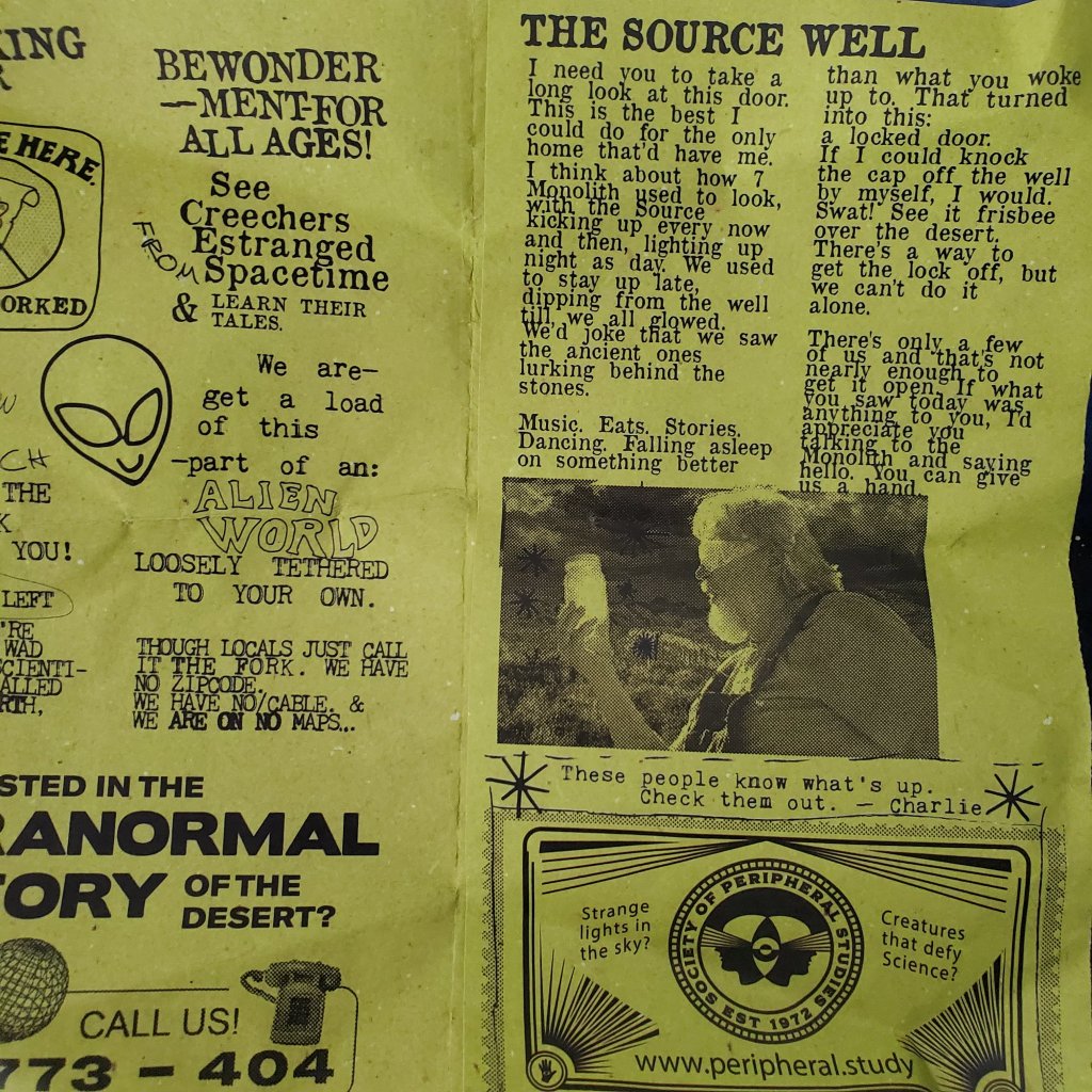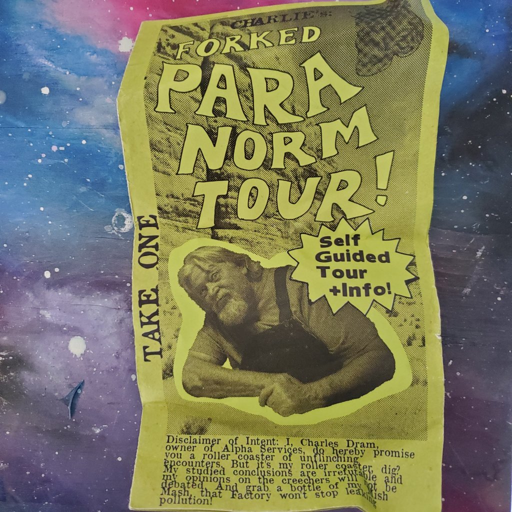 Charlie Dram: Sir John Falstaff The whole story begins with Charlie Dram; an old garage attendant who lives in the fictional town of Seven Monolith Villiage in Nevada. As you can see in the brochure I photographed above, Charlie runs a small tourist attraction where he guides tours allowing people to see The Forked Earth- a dimensional rift between our world and an alien planet, that is also the fount of a powerful and dangerous place called The Source Well. At some point, Charlie goes into business with his family, who eventually cut him out of their lives.