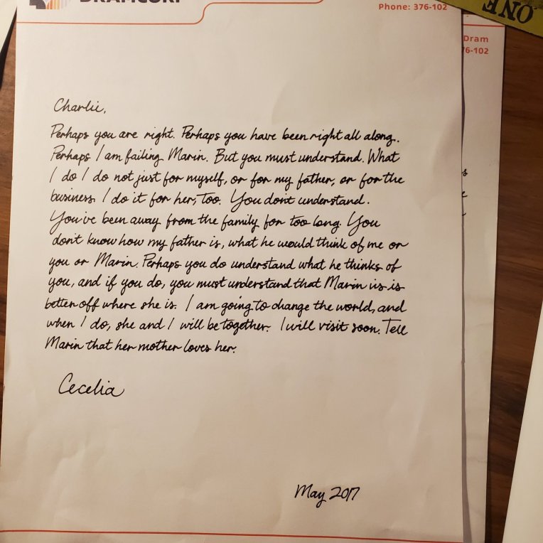 Like I said before, I was expecting Cecelia to be the villain in the story- a power-hungry “thankless child,” (as King Lear puts it), who murdered her own father to take control of his empire. Now it’s possible that she did want to take the company at some point, but what also seems clear is that Cecelia is also seeking redemption for herself, and a reunion for her family.