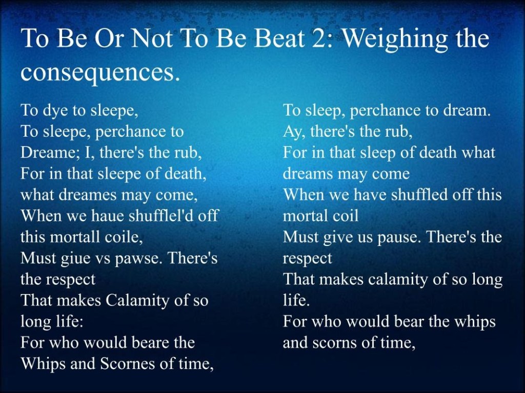 This beat is where Hamlet seems smothered in his frustrations with life.. Rather than making a decision, he’s sidetracked with a laundry list of universal problems. His energy seems up, but it’s unclear why.
