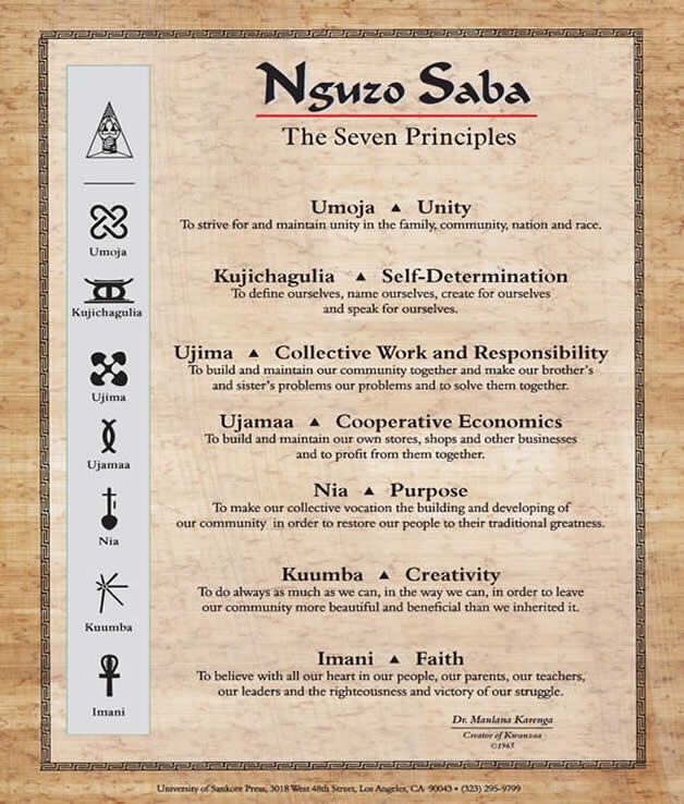 Official Kwanza website: http://www.officialkwanzaawebsite.org/NguzoSaba.shtml