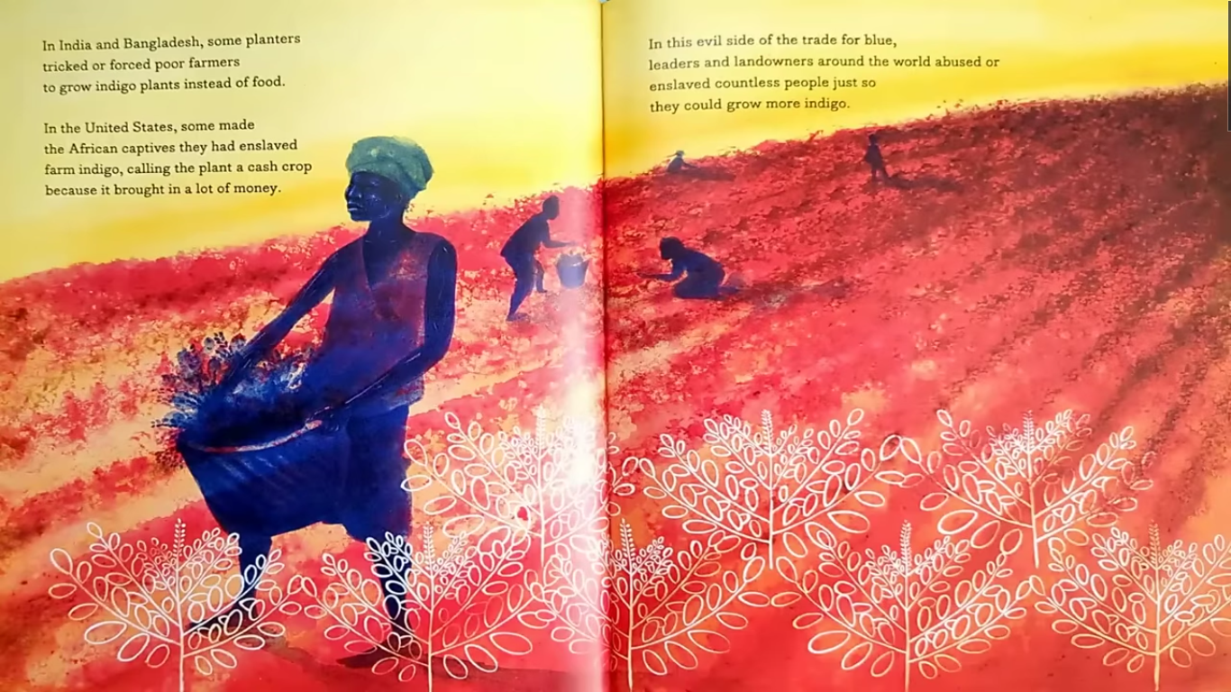 As the review above shows, the book doesn’t focus on European royals or colonialist countries that bought and wore blue clothing, it focuses on the countries that make blue in places like Africa, Asia, and Central or South America. It also doesn’t disguise the fact that the slave trade in America was partially used to gather indigo plants, which the illustrator poignantly represents on the page where slaves are painted with blue dye- they lived and died for the color of their skin, and for the color they were forced to cultivate.
