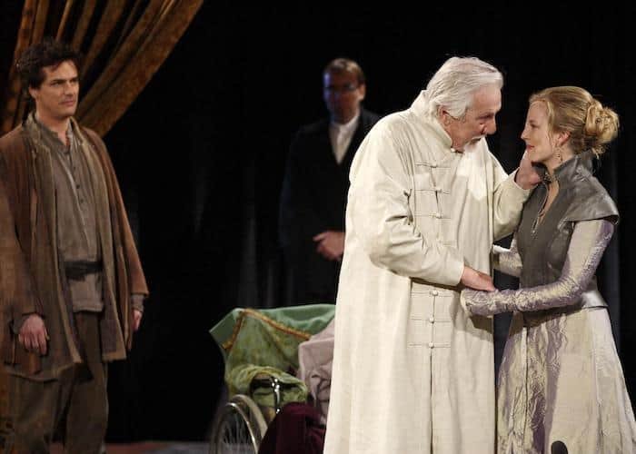 What’s really great about this season is that it doesn’t just show the dark and light aspects of Lear, it also questions the ethics of Kent and Cordelia, (the heroes of the play), who try to save him. Geoffrey eventually plays Kent in the final episode, and it’s quite obvious that he mirrors Kent’s arc; sacrificing everything to help Charles play Lear one last time. He and Anna (who is basically Cordelia in this season) even get Charles drugs to help him with the pain of cancer. Charles’ desire to play Lear mirrors Lear’s desire to play the king; they are both addicted to something that is ultimately killing them.